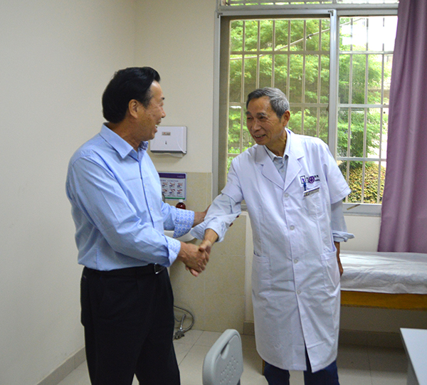 ▲曹學(xué)東總裁向市慈善總會(huì)陳志剛會(huì)長(右一)介紹我院的情況